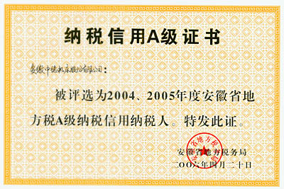 我公司繼被省地稅局評為“2001-2002年度省地稅A類納稅信譽等級單位”后,近日又被省地稅局評為“2004-2005年度安徽省地方稅A級納稅信用納稅人”。這是省地稅局對納稅人給予的最高榮譽,也充分體現了省地稅局對我公司近年來在稅務登記、納稅申報、稅款繳納、財務管理、納稅資料報送、發(fā)票管理等方面工作的認可。