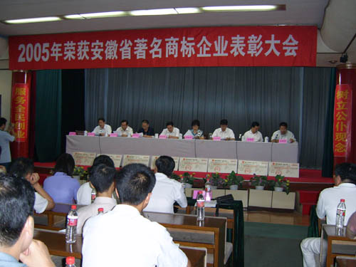 2006年7月26日下午,馬鞍山市2005年獲省著名商標(biāo)企業(yè)表彰大會(huì)在市政府東二樓會(huì)議室舉行,出席本 次會(huì)議的主要領(lǐng)導(dǎo)有省工商局副局長(zhǎng)黃家華、市人大常委會(huì)副主任杜永田、市政府副市長(zhǎng)劉榮華、市政協(xié) 副主席孫文植、市政府副秘書長(zhǎng)王興無(wú)、省工商局商標(biāo)局局長(zhǎng)劉國(guó)建等。