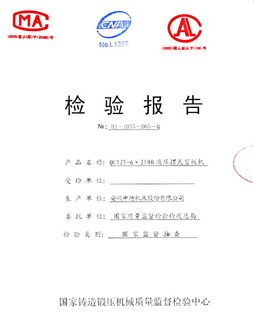 根據(jù)2006年第4季度剪板機國家監(jiān)督抽查實施方案,受國家質(zhì)量監(jiān)督檢驗檢疫總局委托,國家鑄造鍛壓機械質(zhì)量監(jiān)督檢驗中心,于2006年9月23日,對本公司產(chǎn)中德牌液壓擺式剪板機進(jìn)行了現(xiàn)場檢驗。近日,我公司收到了本次抽檢的結(jié)果通知單及檢驗報告,結(jié)果為:合格。