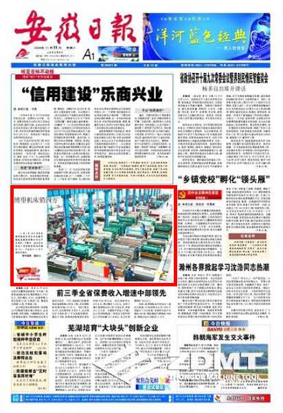 今日(2009年11月11日)《安徽日?qǐng)?bào)》頭版刊載《博望機(jī)床銷(xiāo)四方》的圖片新聞報(bào)道。在我公司大型車(chē)間圖片中,配出如下文字報(bào)道:11月6日,位于當(dāng)涂縣博望鎮(zhèn)的民營(yíng)企業(yè)安徽中德機(jī)床股份有限公司生產(chǎn)車(chē)間里一片繁忙。該企業(yè)今年前三季度銷(xiāo)售量同比增長(zhǎng)35%,產(chǎn)品出口30多個(gè)國(guó)家和地區(qū)。(特約攝影 謝富樂(lè))