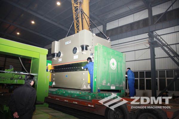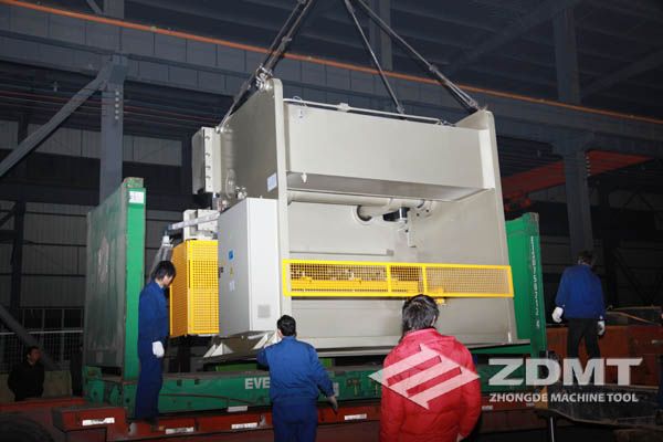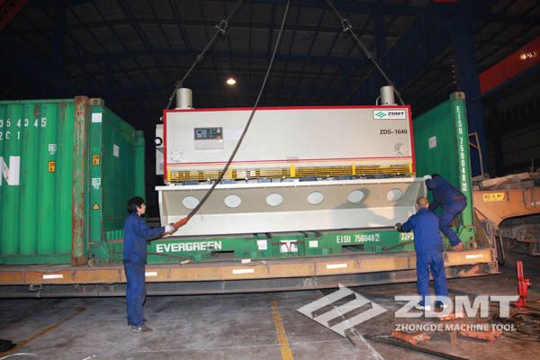 公稱壓力500噸的數(shù)控折彎機和剪切能力16毫米的數(shù)控閘式剪板機分別超過30噸和20噸,外形尺寸完全超過了普通集裝箱的尺寸。像這種類型的機器在國內(nèi)發(fā)貨很平常,但是對于出口來說情況卻完全不同。由于框架箱運輸?shù)奶厥庑砸约昂_\運輸?shù)娘L險性,對機器的包裝和捆扎是對工廠的新考驗。