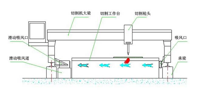 下吸式煙塵凈化系統(tǒng)抽風是通過下吸式抽風切割臺來實現(xiàn)的,下吸式抽風切割臺分成若干個區(qū)域,每個區(qū)域設計有風門吸風,切割槍頭在每個區(qū)域切割時,相應區(qū)域的風門打開抽風,將切割機的粉塵吸除。